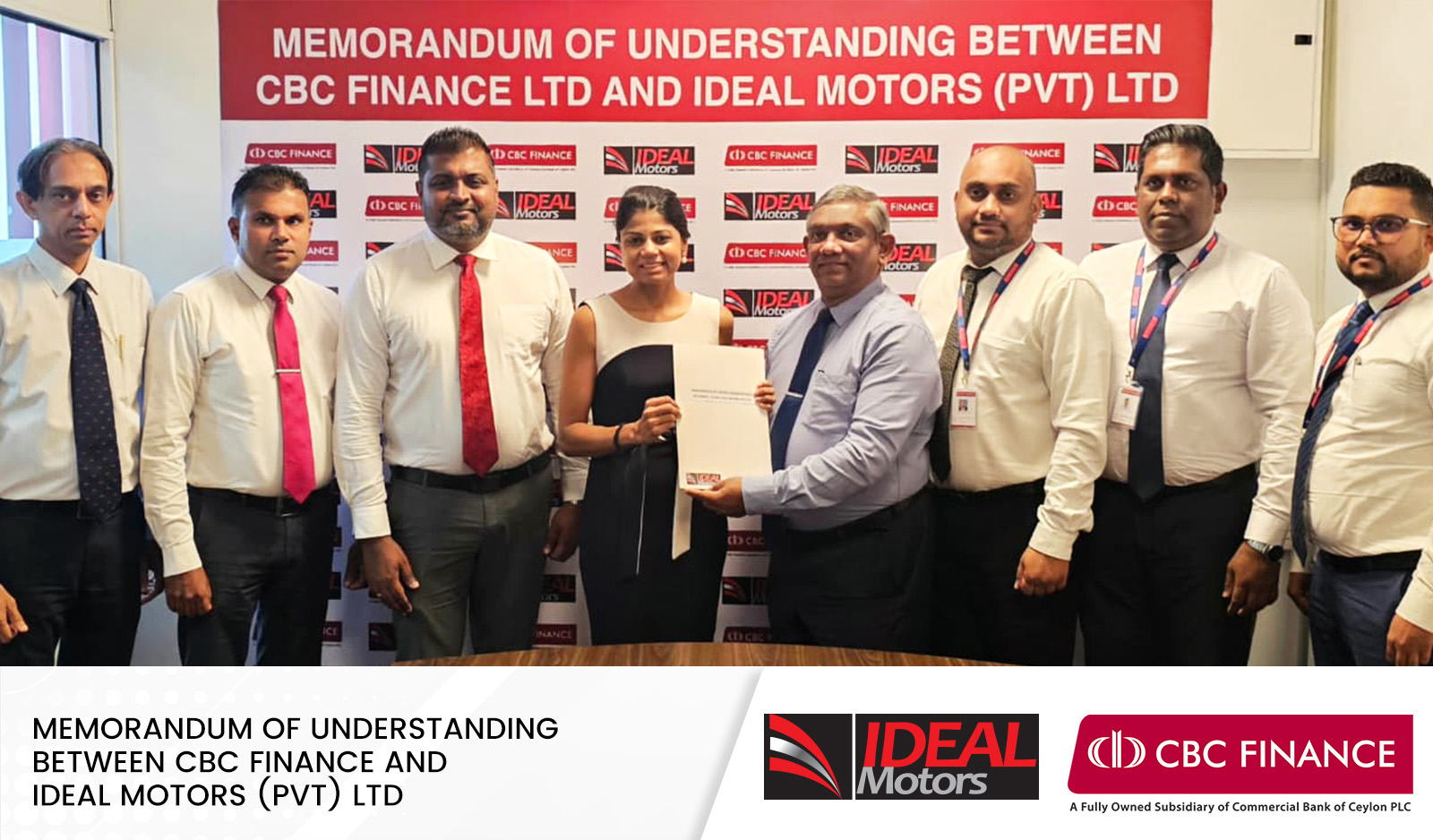 The MoU was officially signed by Mr. Delakshan Hettiarachchi, Executive Director – CBC Finance Ltd., and Ms. Nimisha Welgama, Director – Legal & Corporate Affairs, Ideal Group of Companies.